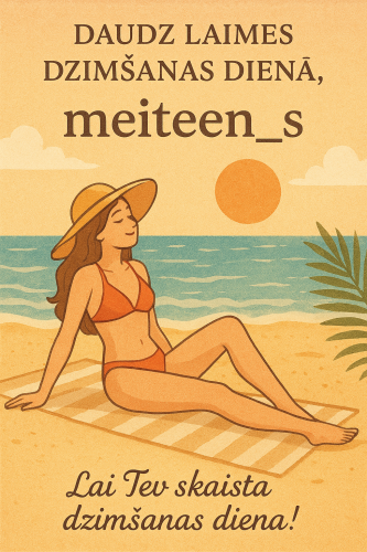 Sveicam Meitēnu dzimšanas dienā! Best | 2025.08.27 09:06 | Skatīts: 193 Sveicam Meitēnu dzimšanas dienā! Novēlām Tev mieru, prieku un daudz, daudz saulainu mirkļu!Lasīt citus šī autora blogus Patīk 1 Komentāri(6) Sfinksa 2025-08-27 10:07 Piewienojos💐💐💐 Vislabaakaa 2025-08-27 11:35 🍰 peluks1211 2025-08-27 11:45 Sumināta🥳🍾🍰💐 aksausmas 2025-08-27 13:04 Lai viss ieceretais piepildas!!!💐🎂🥂🍾 Anciiite 2025-08-27 19:19 Apsveicam! 🥳🥳🥳🎊 zaraza 2025-08-27 21:38 Happy 👍 Lai komentētu ir jāienāk